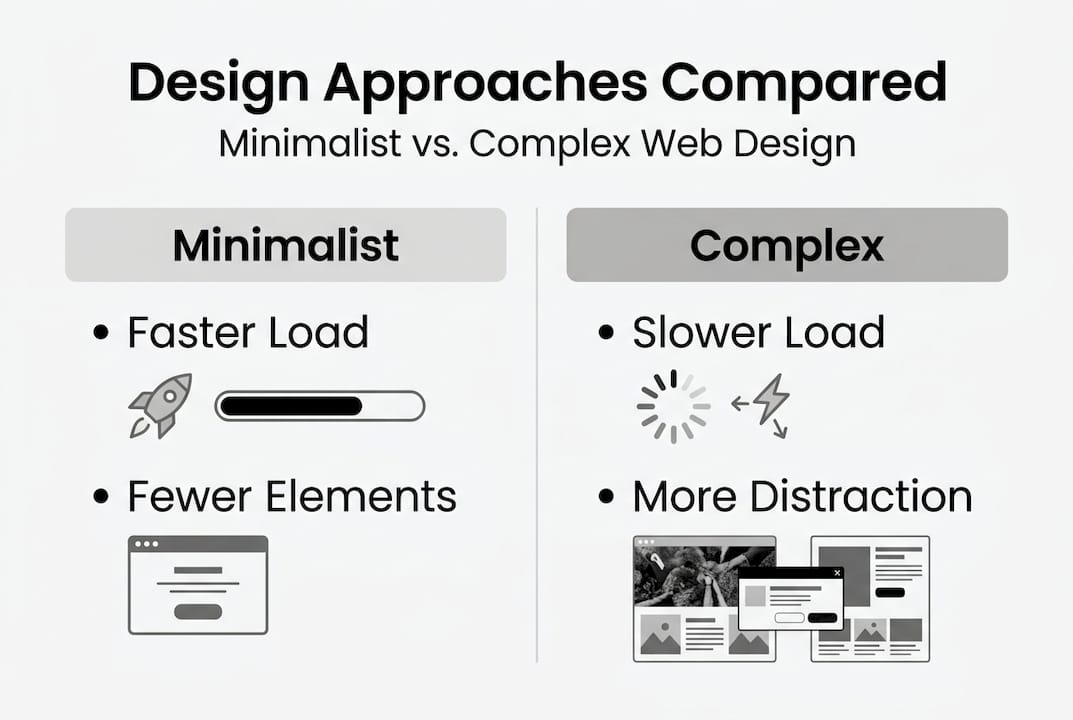 Minimalist sites load significantly faster because they include fewer HTTP requests, smaller file sizes, and streamlined code. Data shows minimalist sites average 1.2-second load times compared to 3.8 seconds for complex designs. This speed advantage directly improves user experience and conversion rates, since every additional second of load time reduces conversions by approximately 7%. Faster sites also rank better in search results, creating compound benefits.